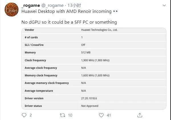 關(guān)于華為電腦的資料目前媒體們所知不多。有一位海外推主曾經(jīng)拿出過一份配置資料:顯示華為臺式機(jī)搭載了Ryzen 5 PRO 4400G 處理器,6核12線程,基礎(chǔ)頻率3.7GHz,最高頻4.3GHz。